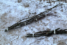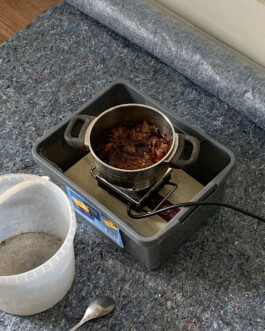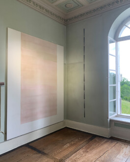 An den Ästen waren auch Blätter, die ich ebenfalls mitnahm, mit Wasser und ohne weitere Zugaben zu einem Farbsud kochte und auf zwei der bestehenden Wandtafeln auftrug. Links neben dem Blutbuchenast befindet sich die Farbe der Blutbuchenblätter, rechts neben dem Ahornast, die Farbe der Ahornblätter. Die Form der Farbflächen bezieht sich auf die Fensteröffnungen, durch die man von den Ausstellungsräumen auf die Orte sehen kann, wo die Äste wuchsen. Die Arbeiten sind - mit Ausnahme des dritten Astes in der Mitte des Raumes, der von einem Haselnussstrauch vor unserem Haus in Berlin stammt, aus Material hergestellt, das ich vor Ort vorgefunden habe. Zur Materialität der Installation gehört für mich auch, dass der Transport der Arbeiten im Handgepäck erfolgen konnte und kein zusätzliches Material eingesetzt werden musste.