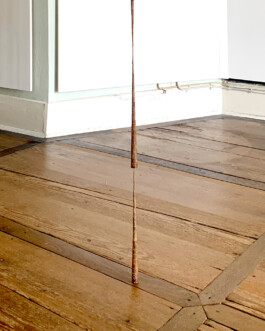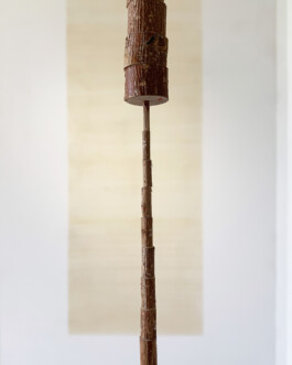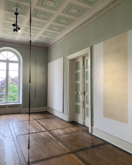 Die Installation besteht aus drei Holzobjekten und dazugehörenden Wandmalereien, die jeweils - die Skulpturen und die Malerei - aus einem einzelnen Ast gefertigt wurden. Der Ast links neben dem Fenster stammt von einer 160 Jahre alten Blutbuche, die im Winter 2024 im Schlosspark von Fachsenfeld gefällt werden musste. Den Ast verarbeitete ich in meinem Atelier in Berlin zu einer Kette, indem ich ihn in Segmente zerschnitt, nummerierte, lochte und in anderer Reihenfolge auf eine Schnur auffädelte. Das Gleiche machte ich auch mit dem Ast eines Spitzahorns, der auch im Schlosspark wuchs und jetzt rechts neben dem Fenster hängt.